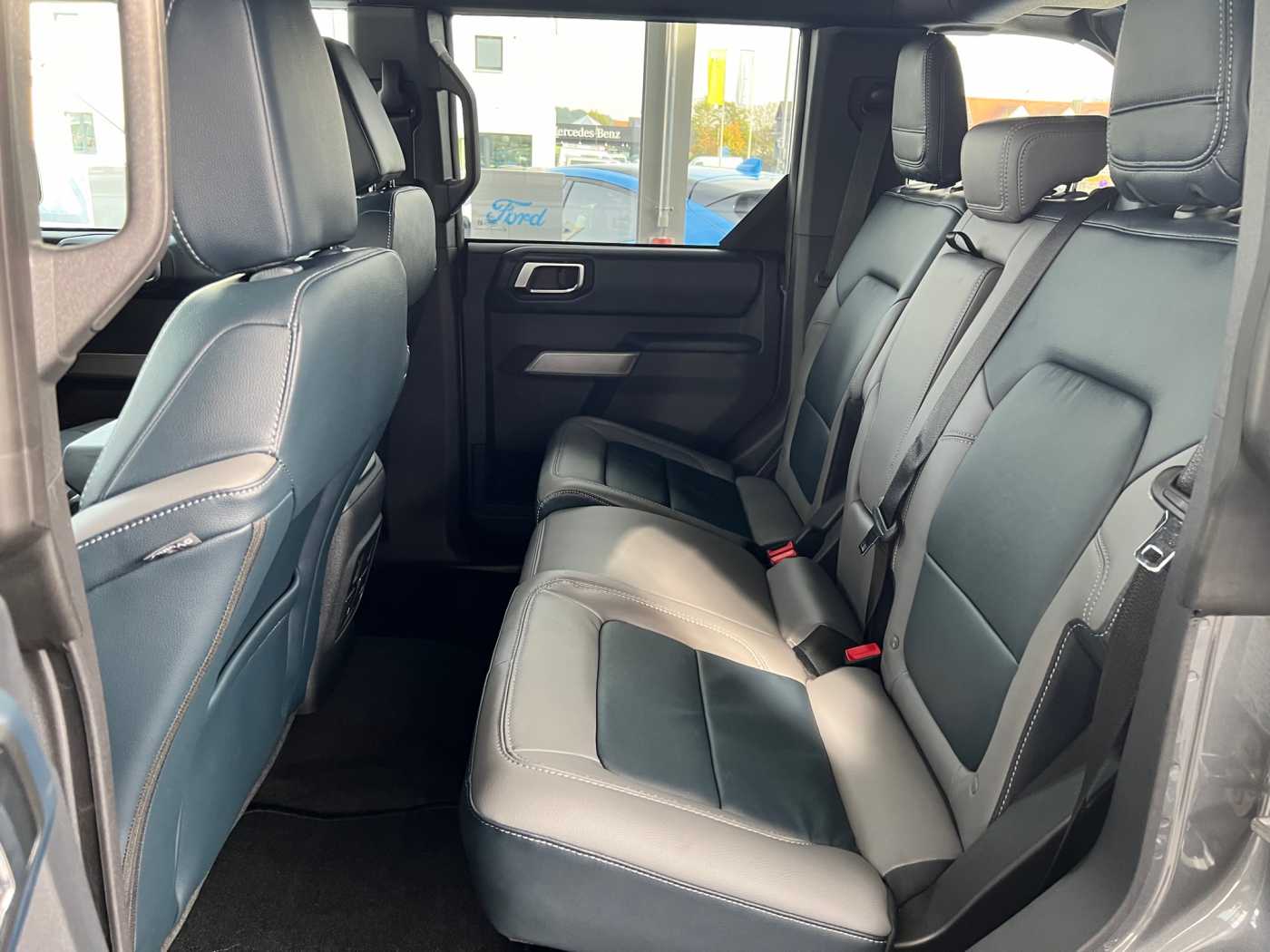 Ford Audio-Navigationssystem SYNC 4, Android Auto/Apple CarPlay (kabellos), Telefonvorbereitung mit Bluetooth-/USB-Schnittstelle, DAB/DAB+ Radio, FordPass Connect, Premium Soundsystem von Bang & Olufsen, induktive Ladestation, Digitale Instrumententafel, 2-Zonen- Klimaautomatik, adaptive Geschwindigkeits-Regelanlage (ACC), Fahrspur-Pilot, Spurhalte-Assistent, Post-Collision-Assistent, Berganfahr-/Bergabfahr-Assistent, Totwinkel-Assistent, Ford Key-Freesystem, 360-Grad-Kamera mit "Split-View", Frontkamera, Rückfahrkamera, Parkpilot-System vorne und hinten, LED-Scheinwerfer, Tagfahrlicht, Nebelscheinwerfer, Scheinwerfer-Assistent Tag-/Nachtsensor, Sitzheizung vorne, Lenkrad beheizbar, el. verstellbare Sitze, 10-fach einstellbarer Fahrersitz, Heckscheiben hinten getönt, el. Außenspielgel anklappbar/beheizbar, Sperrdifferential vorne und hinten, Allradantrieb, Vorderachsabschaltung, Terrain Management System™ mit G.O.A.T. Modi, Unterbodenschutz, abnehmbares Hardtop, Abschlepphaken vorne+hinten (2 Stück jeweils), Trittstufen, Heckklappe Easy Lift, Sportbügel, SOFTCOVER für Ersatzrad/Laderaum/Dach, Ersatzrad, 18 Leichtmetallräder auf A/T Reifen mit Schneeflockensymbol